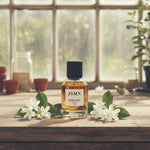 JSMN Jasmine 50 mL botanical perfume in a minimalist glass bottle with a matte black cap and a dark golden hue, set against a pale gray backdrop.