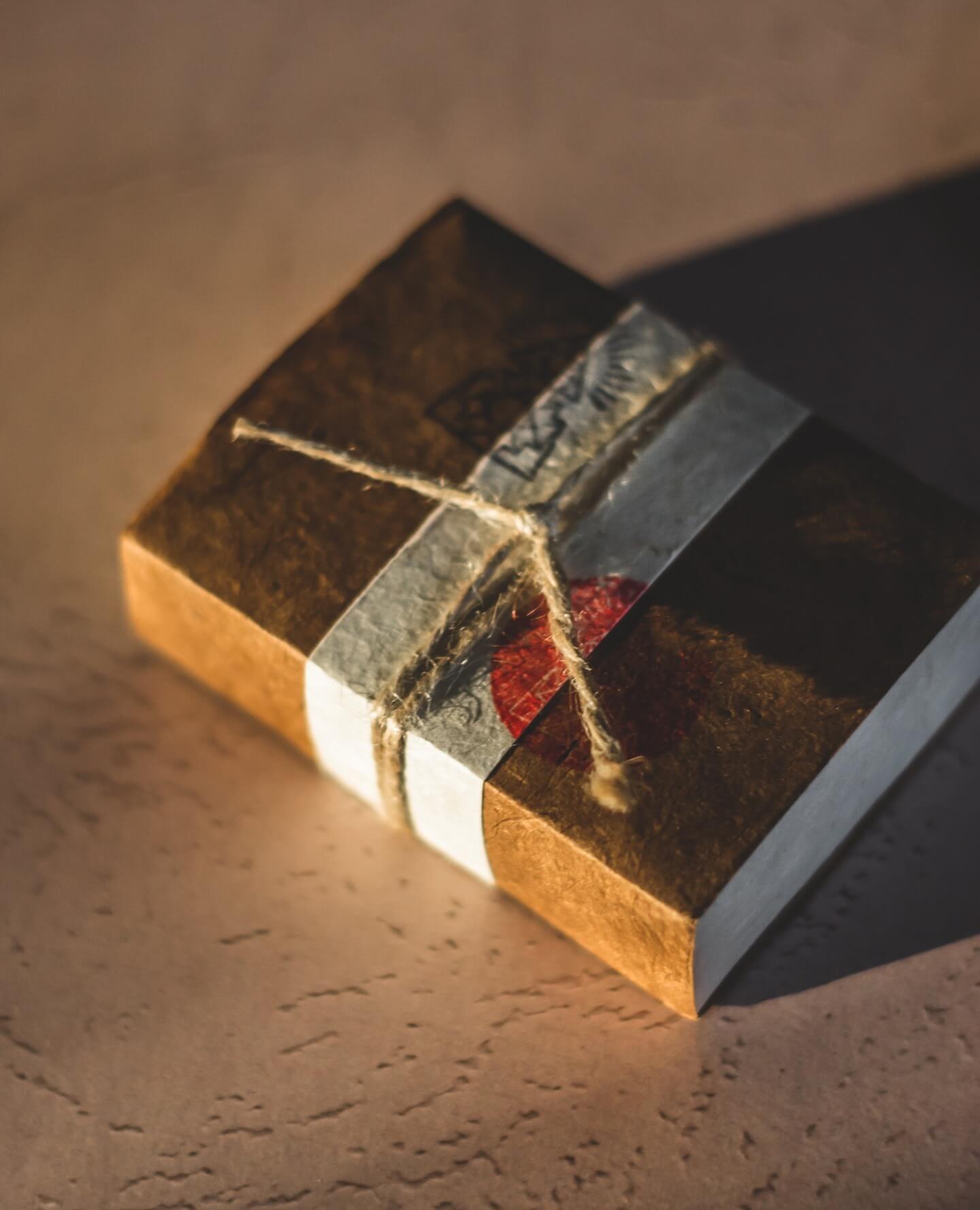 Vegan essential oil soap is hand-wrapped with traditional Nepalese Lokta paper. The blend of 15 different oils include: Lavender, Coriander, Patchouli, Cardamon, Marjoram, Clove, Cinnamon, Vetiver & Geranium and more.