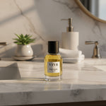 VTVR Vetiver 50 mL botanical perfume in a minimalist glass bottle with a matte black cap and golden hue, set against a pale gray backdrop.